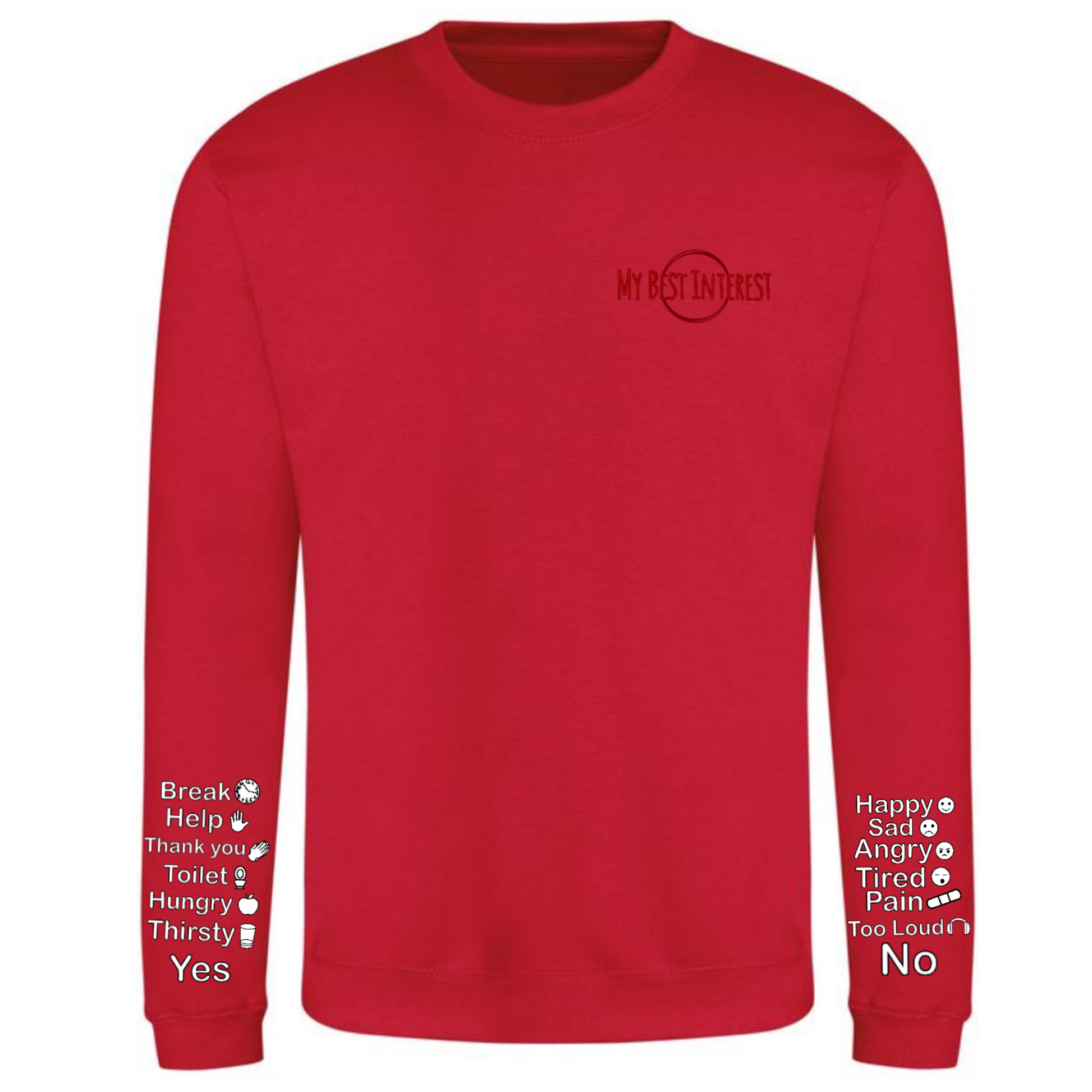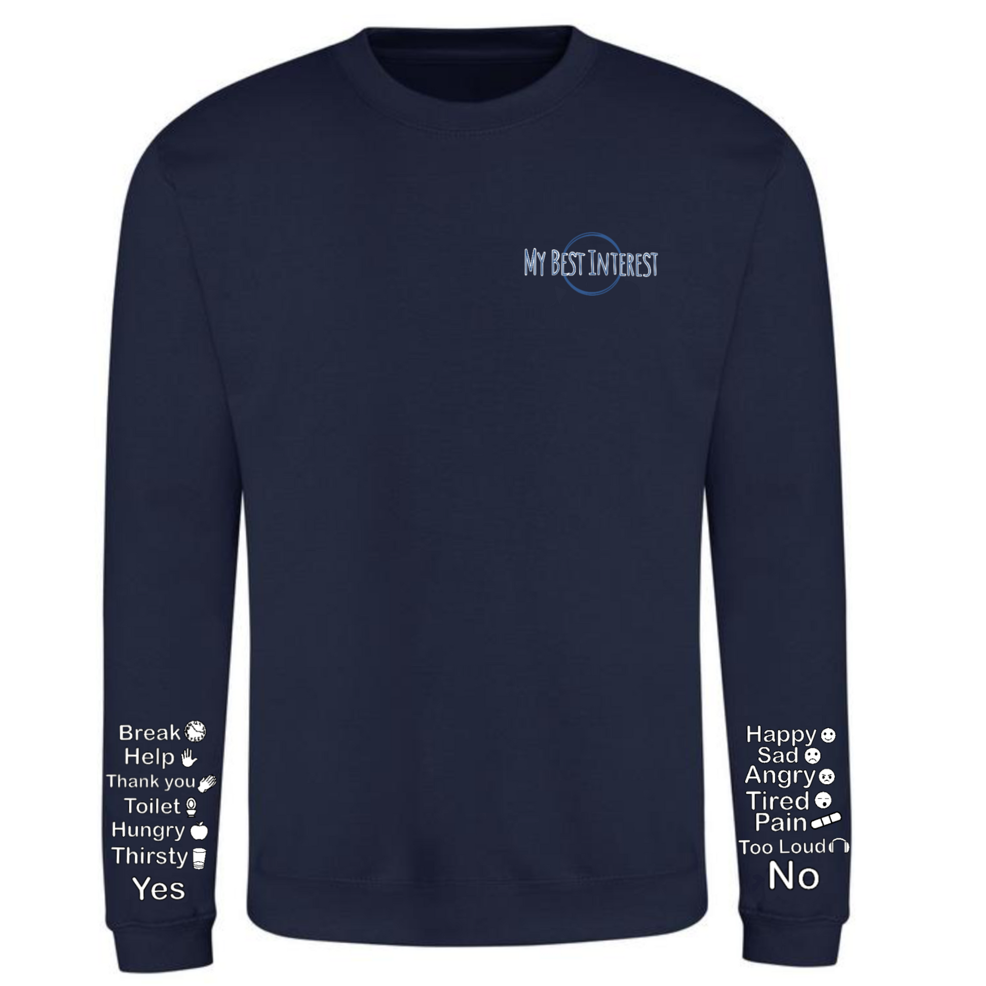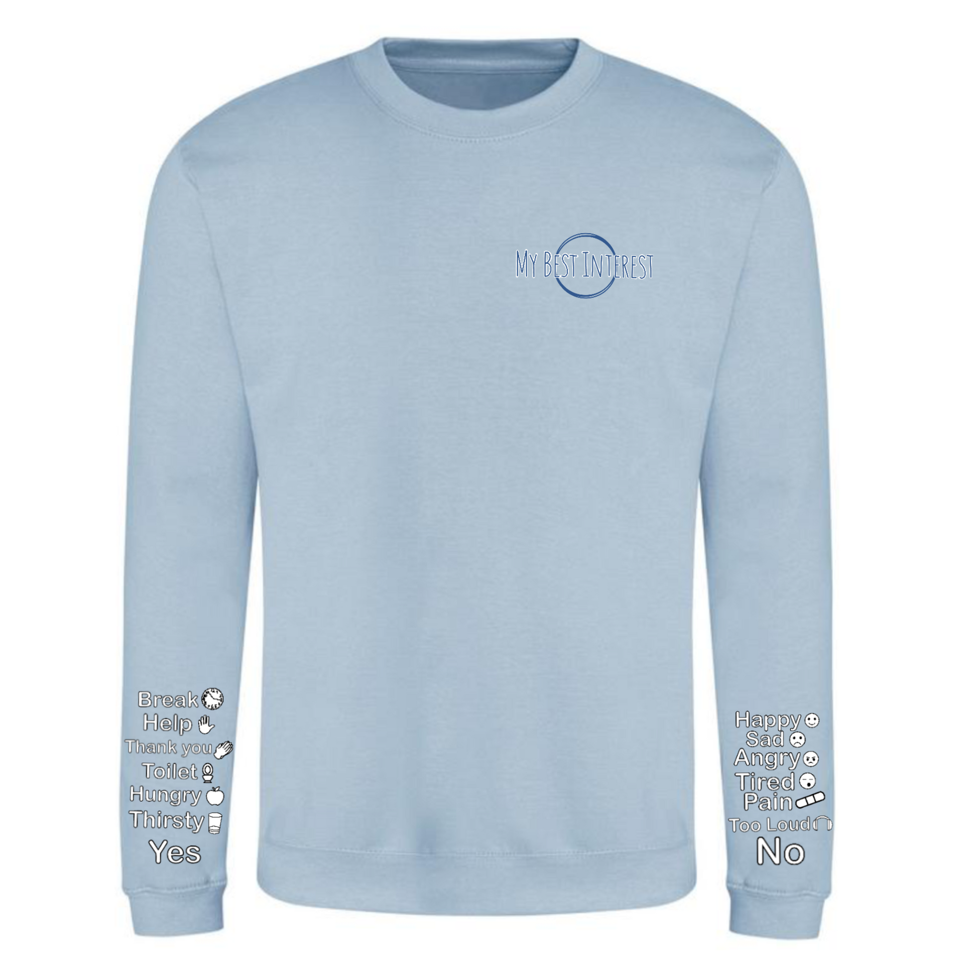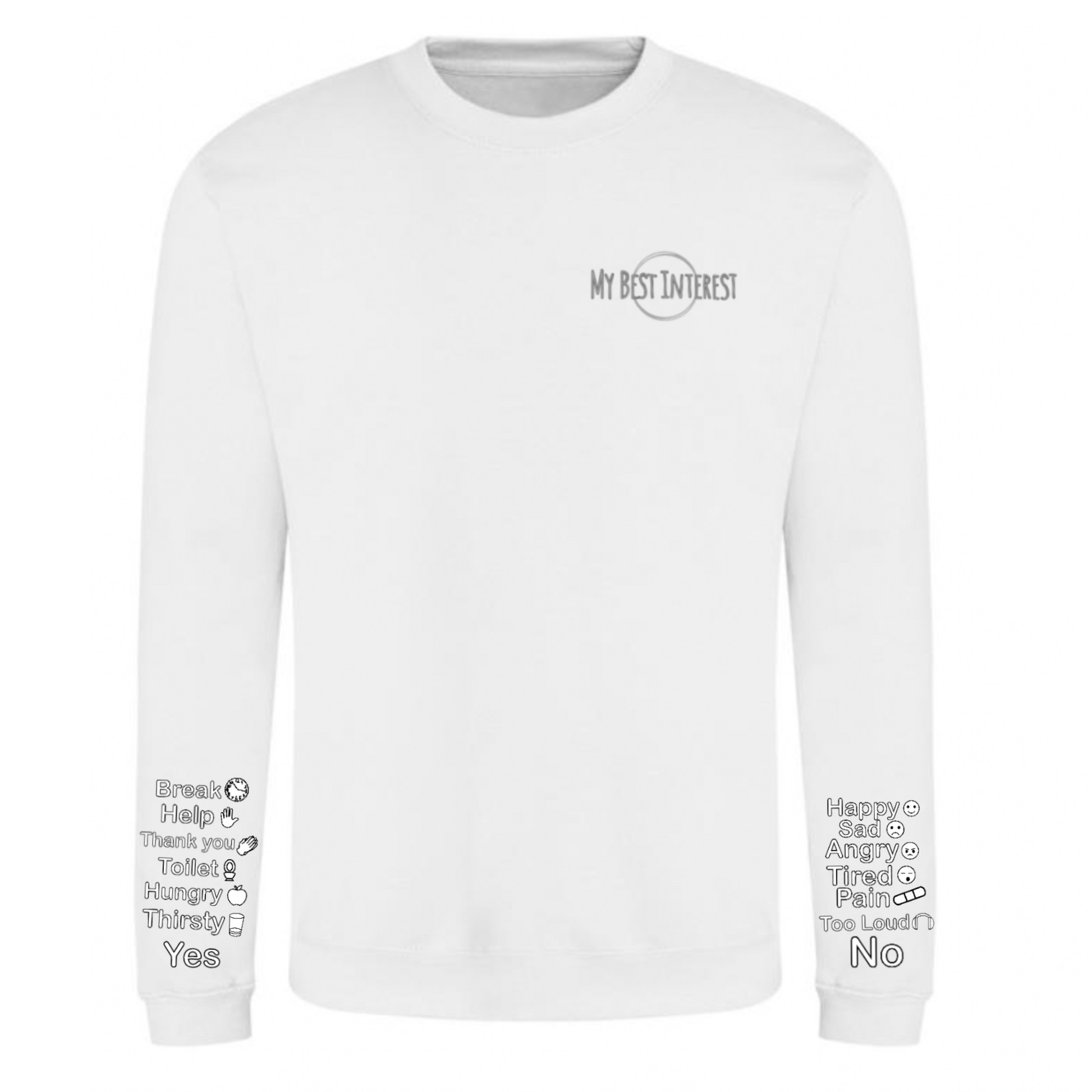 This'Communication Clothing' item features words and little icons that you can point to when you are unable to communicate verbally. Just use the words or icons to show how you’re feeling or to answer questions without saying a word! The words are: